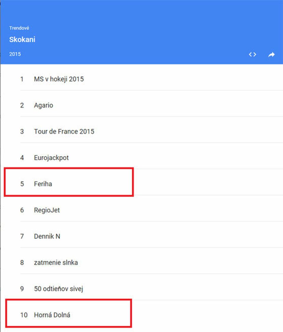Najznámejší vyhľadávač zverejnil rebríčky najklikanejších relácií za rok 2015. Televízia Markíza si pripísala na svoje konto hneď dva tromfy. V rebríčku TOP 10 s názvom Skokani, sa v prvej polovici, na piatom mieste ocitla turecká telenovela Feriha. A nebola jediná. Svoje miesto si našiel aj populárny seriál Horná Dolná, ktorý sa rovnako ako Feriha stal jedným z najvyhľadávanejších relácií. Patrí jej desiata priečka. V rebríčku s názvom Médiá, poprednú pozíciu získala aj Televízia Markíza, ktorá sa tak stala jedným z najvyhľadávanejších médií na Slovensku.