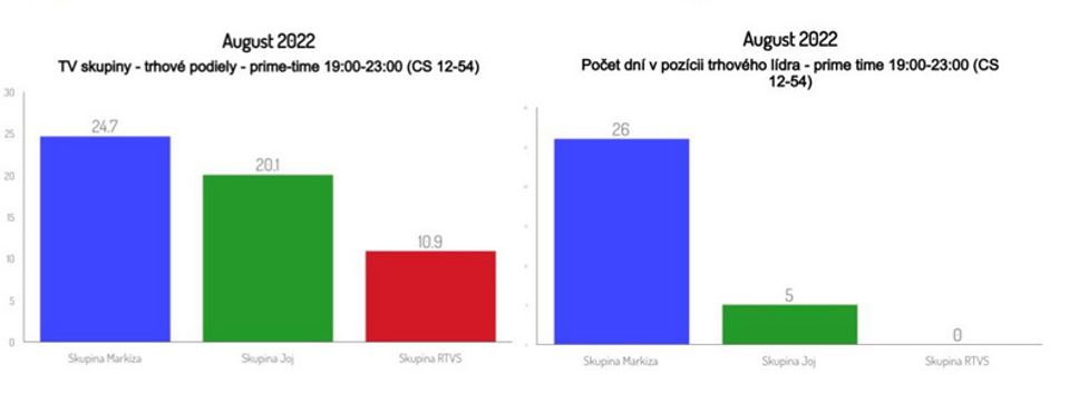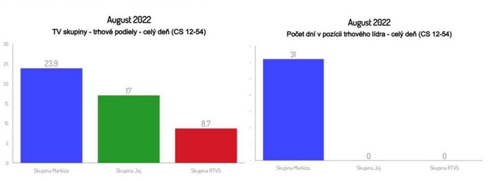 Skupina Markíza bola v auguste 2022 jednotkou na trhu aj v prípade divákov starších ako 12 rokov s priemerným celodenným trhovým podielom 21,7 % a odstupom 5,3 percentuálneho bodu od konkurenčnej skupiny Joj (16,4 %). Trhovým lídrom bola aj v tomto prípade každý jeden z 31 dní uplynulého mesiaca.
