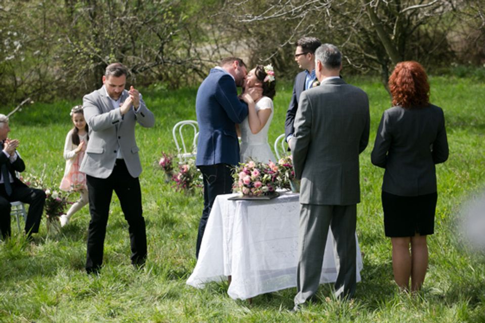 Prvý novomanželský bozk a veselý Igor v pozadí.