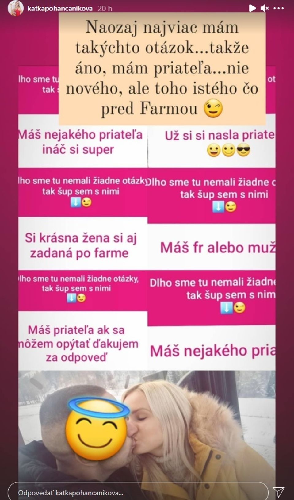 Katka im vyhovela a vyjadrila sa. Áno, má priateľa a spolu boli aj pred Farmou. Dokonca zverejnila aj spoločnú fotografiu, na ktorej si dávajú bozk. Evidentne však nechce prezradiť jeho identitu, preto mu tvár preventívne prekryla emotikonom.