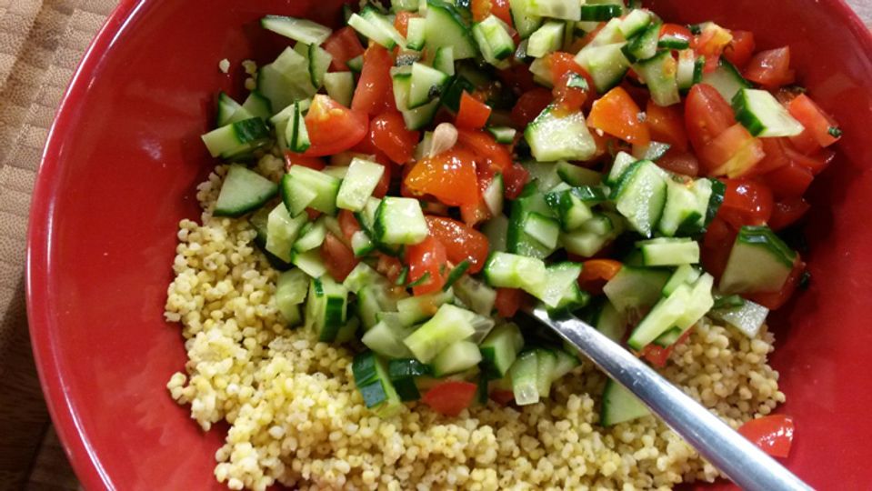 V malom hrnci privedieme vodu a pšeno do varu, prikryjeme a varíme miernym varom dokiaľ sa všetka voda absorbuje. Takto pripravené necháme vychladnúť. Zmiešame s uhorkou a paradajkou, ktoré sme nakrájali na kocky. Na záver pridáme olivový olej, citrónovú šťavu, soľ, roztlačený cesnak a najemno nakrájané lístky mäty.