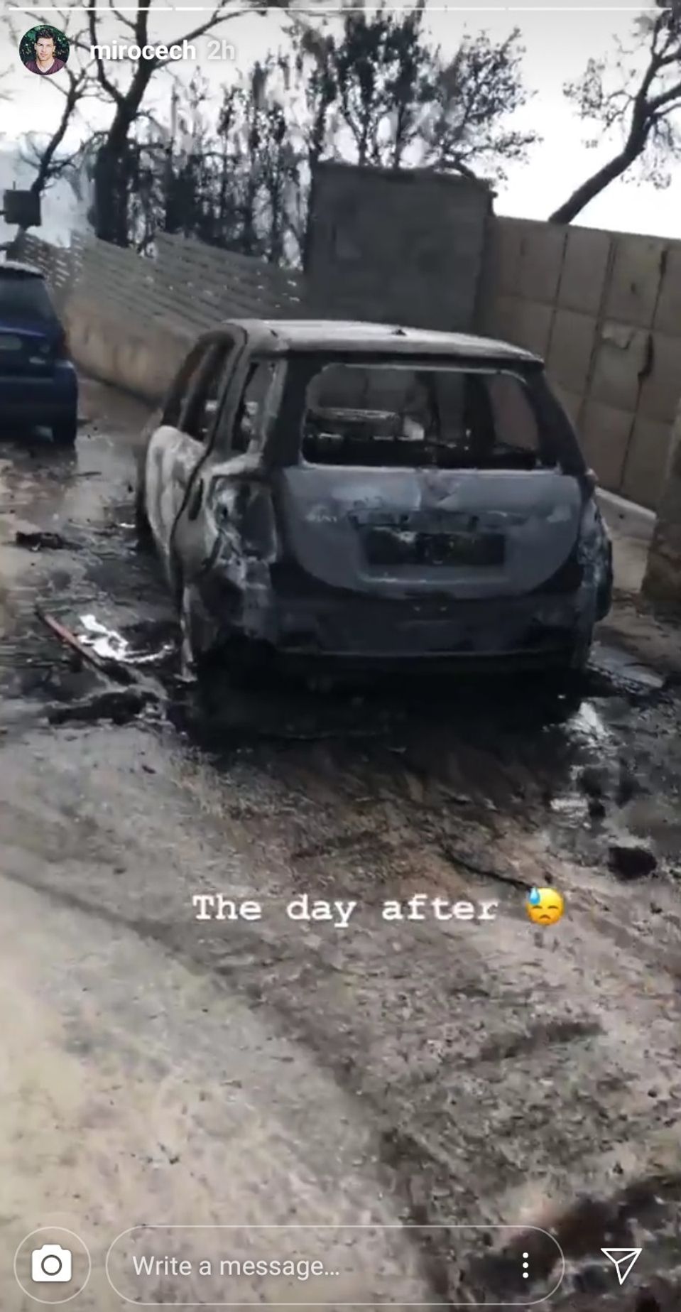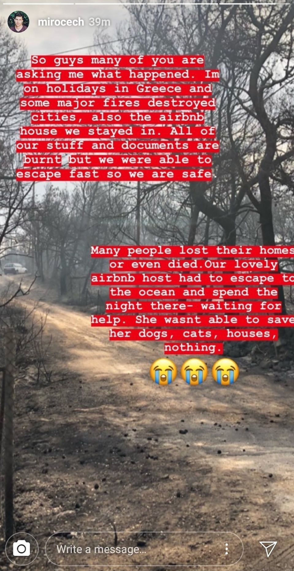 „Všetky naše veci a dokumenty zhoreli,“ napísal. Našťastie, pred ohňom utiekli a sú v bezpečí. Ich hostiteľka musel utiecť k oceánu a stráviť tam noc. „Nedokázala zachrániť svoje psy, mačky, domy, nič,“ dodal.