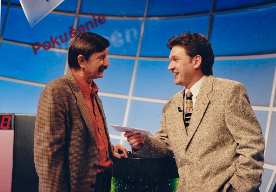 Na fotografii: Jaroslav Čorba s Michalom Ďurišom pri výrobe relácie Pokušenie.