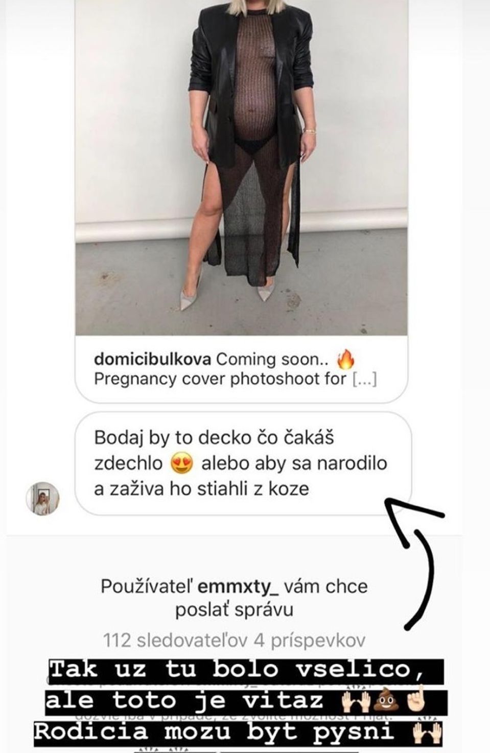 Jednu zo správ, ktorú dostala po zverejnení sexy fotky, by však predýchal už len naozaj málokto. "Fanúšička" totiž priala smrť jej bábätku. Dominika nechutnú správu zdieľala na Instagrame. Veríme, že sa jej na to ozvalo množstvo dobrých ľudí, ktorí jej vyjadrili podporu.