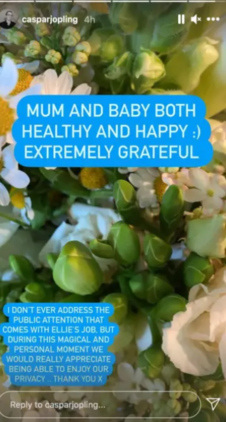 Caspar na Instagrame napísal, že je extrémne vďačný za to, že mama aj dieťa sú v poriadku, že sú šťastní a zdraví. Manžel britskej speváčky dodal, že sú radi, že si tú čarovnú chvíľu mohli vychutnať v súkromí. Pohlavie prvorodeného dieťaťa, meno či fotku preto dvojica zatiaľ nezverejnila.