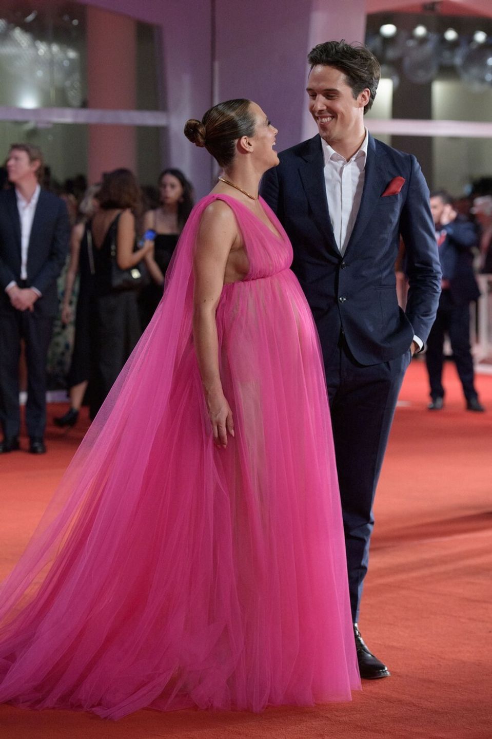 To, že je v požehnanom stave, potvrdila počas záverečného ceremoniálu Medzinárodného filmového festivalu v Benátkach, keď sa ukázala na červenom koberci.